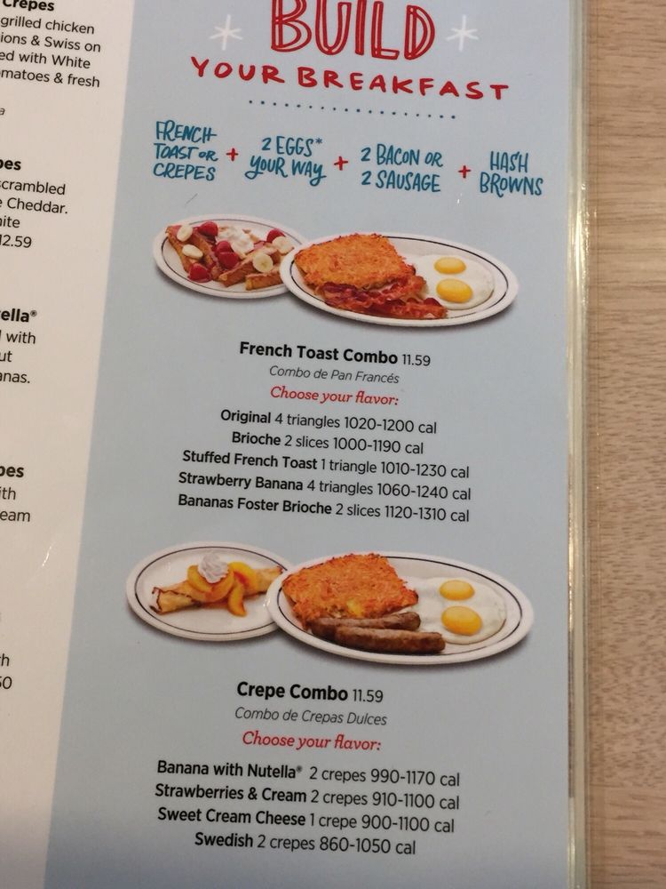 Choose your crepe flavor, served with 2 eggs* your way, 2 custom-cured hickory-smoked bacon strips or 2 pork sausage links & golden hash browns.